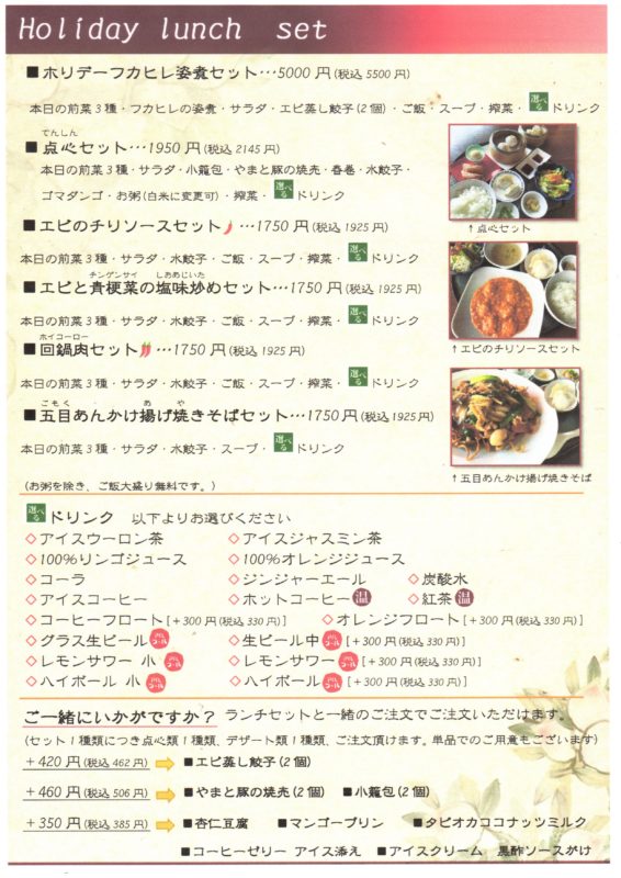 メニューはホリデーランチセット&一品料理です。