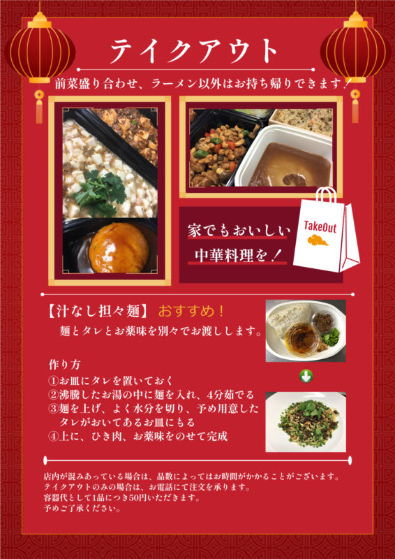 ラーメン類、スープを除く全ての1品料理をお持ち帰りいただけます!!